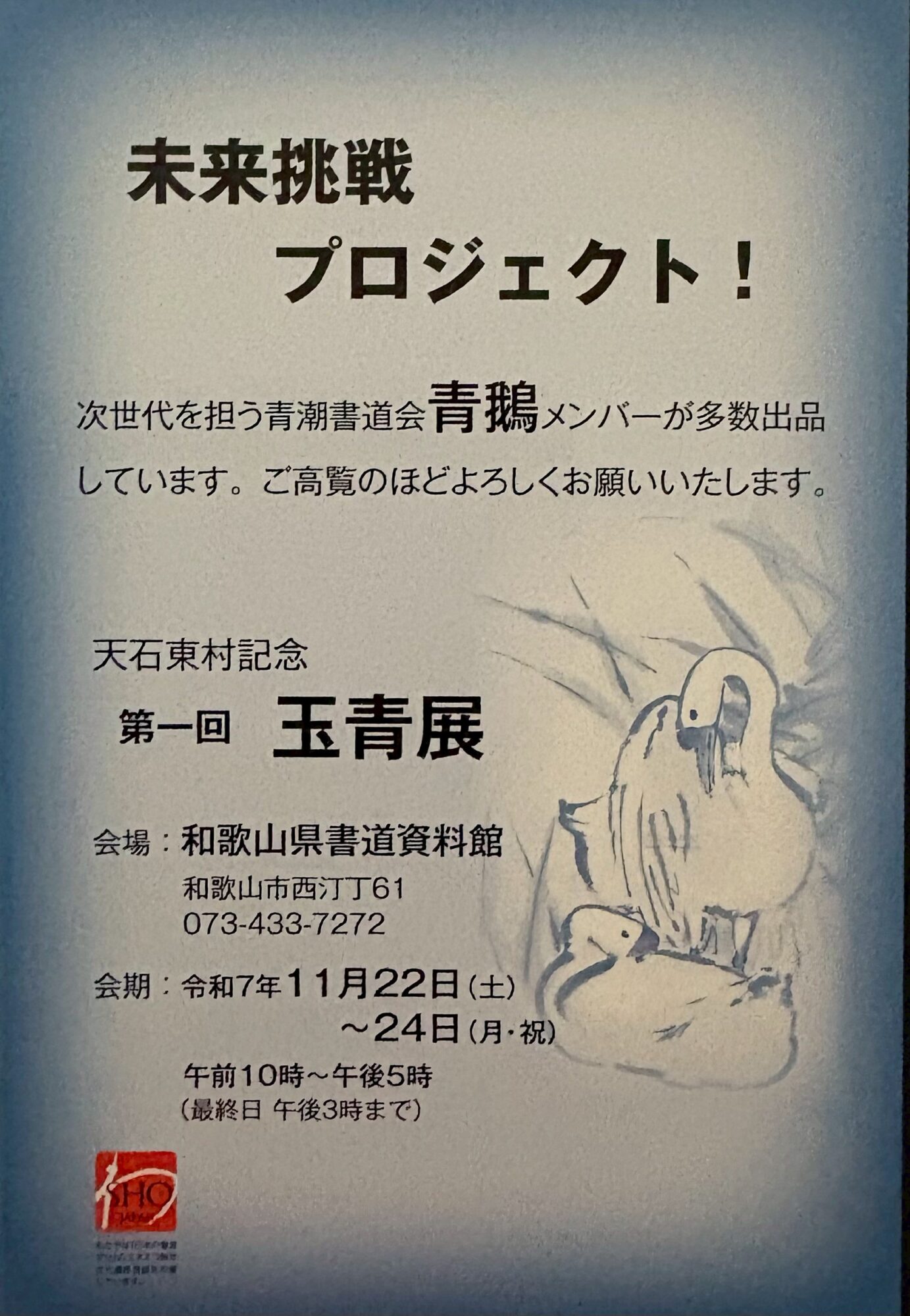 和歌山県書道資料館が主催で開催される、次世代を担う書家たちの展覧会です。 青潮書道会からも多くの青鵝メンバーが応募し、この度展示されることになりました。 皆さま、是非お運びくださいますようご案内申し上げます。